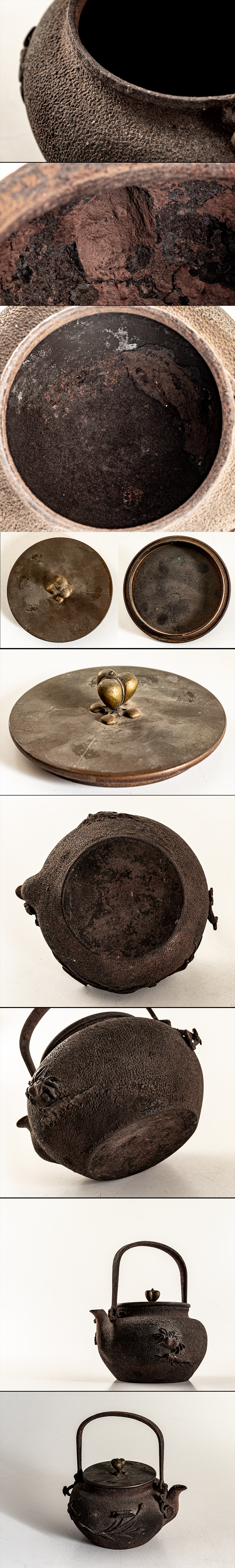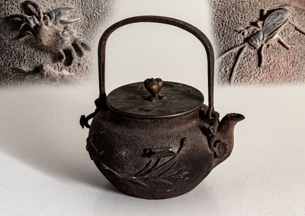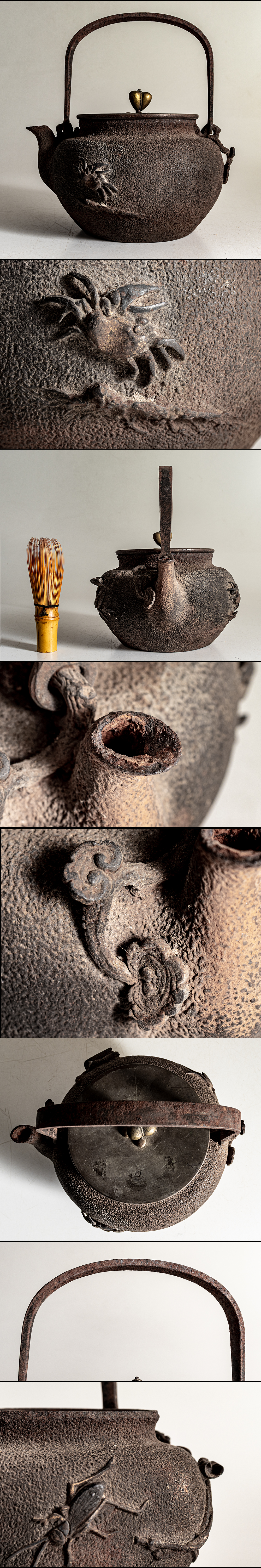 - 時代鉄瓶 釜師造 柚子肌 盛上 霊芝 蟹 蓮 蟋蟀 昆虫紋 鉄瓶