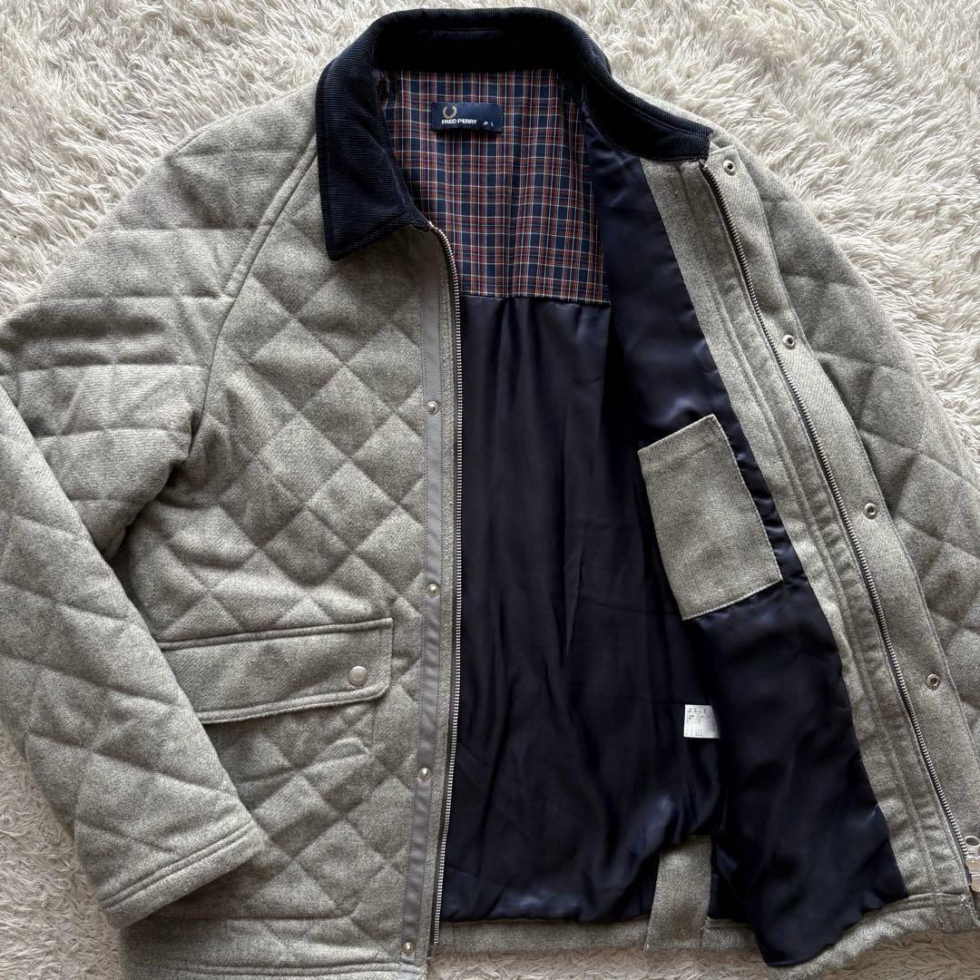 > フレッドペリー ★希少 Lサイズ★ キルティング ジャケット 襟コーデュロイ FRED PERRY ダブルジップ チンストラップ 刺繍ロゴ 灰色 グレー