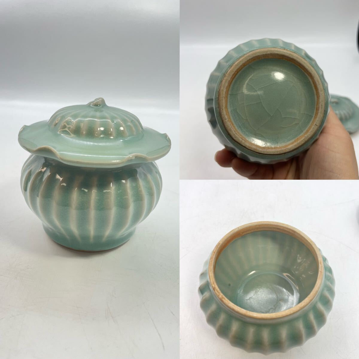 - 唐物 時代物 青磁 陶磁器 香炉 中国古玩 骨董品 中国美術 龍泉窯 蓋付きつぼ 宋風