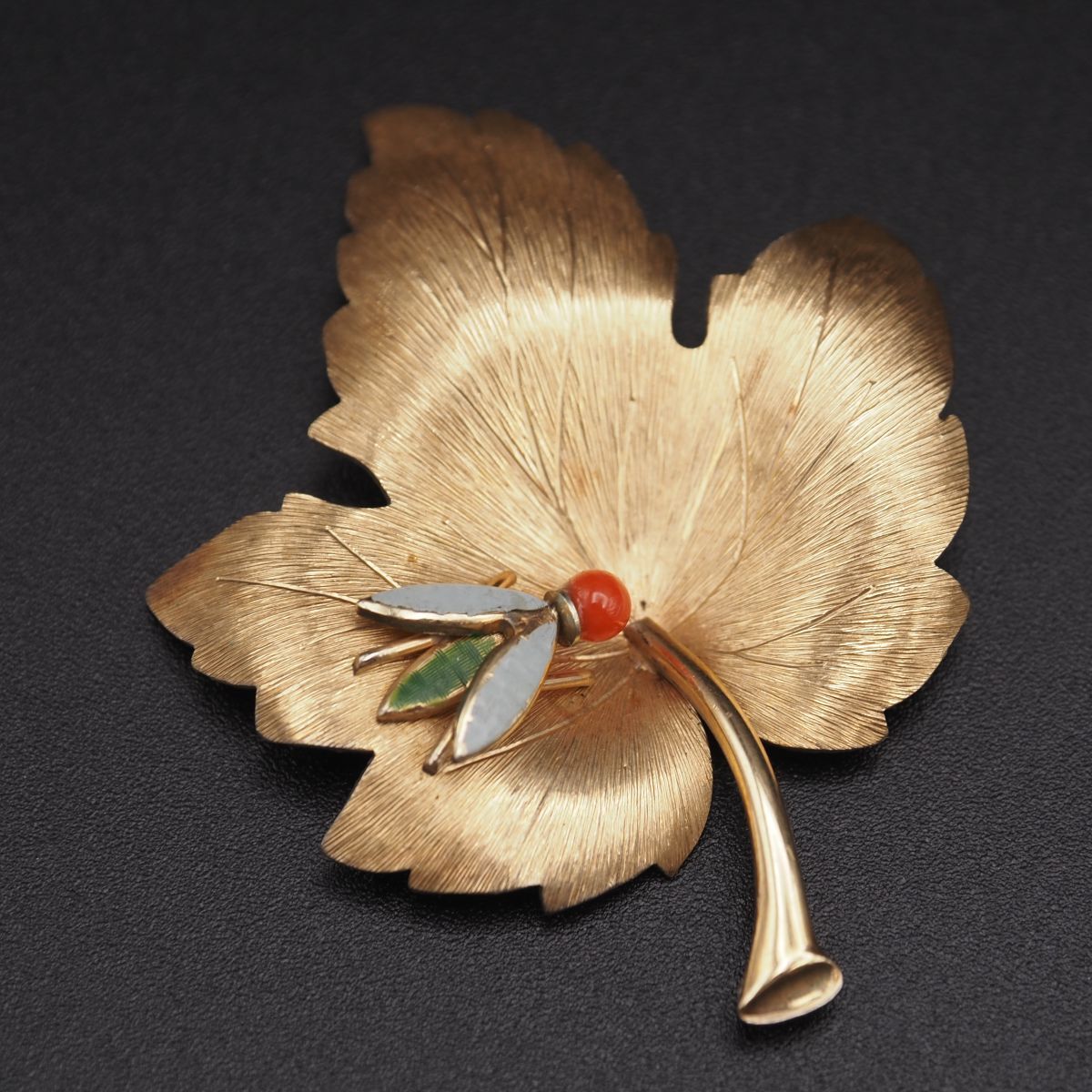 - H003 KREMENTZ クレメンツ ブローチ 葉っぱと虫 ゴールド デザイン アメリカ製 ヴィンテージ