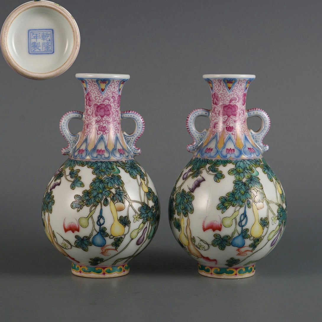 - ▼渡鶴羽▼K6374清乾隆年製 琺瑯彩福禄紋双耳瓶一対・古陶磁器 ・珍品旧蔵・古賞物・時代物