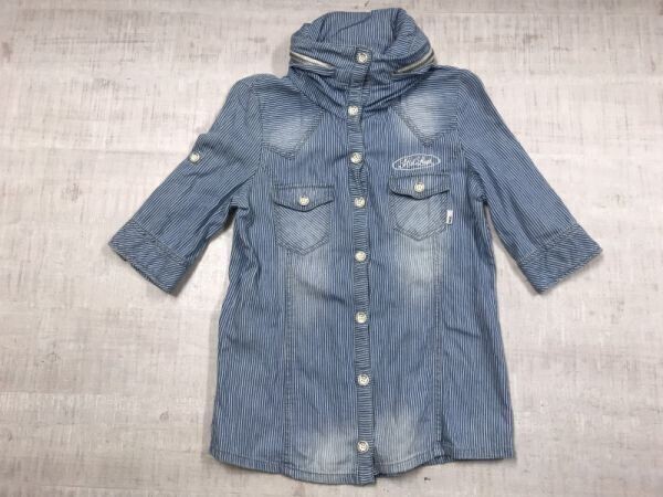 - バックス BACKS ネオグランジ フェアリーコア Y2K 古着 ヒッコリー デニム 七分袖シャツ レディース フード内蔵 ボリュームネック F 青