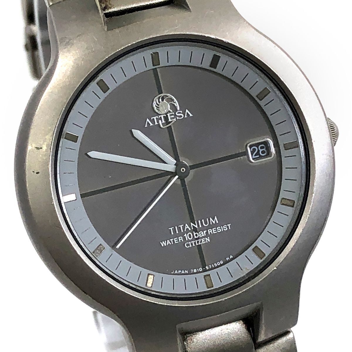 > 美品 CITIZEN シチズン ATTESA アテッサ 腕時計 7810-571568 ソーラー アナログ チタン カレンダー シンプル グレー コレクション