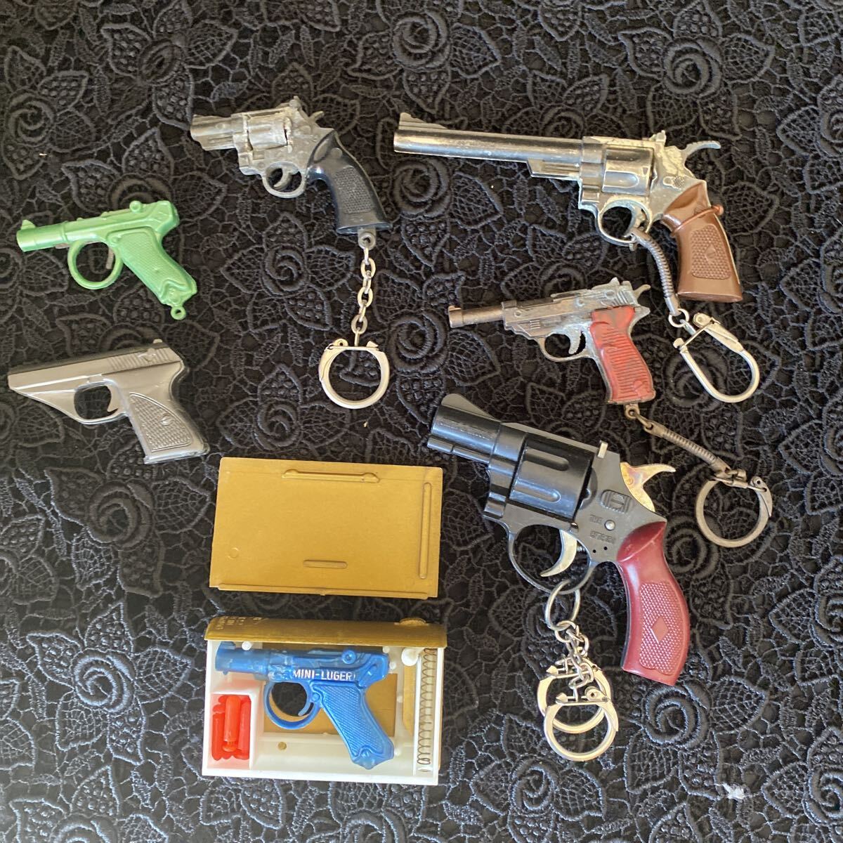 - 拳銃型 ピストル型キ―ホルダー 昭和レトロ てっぽう 玉 MINIBOOKGUN 昭和駄菓子屋玩具 7種類まとめ売り