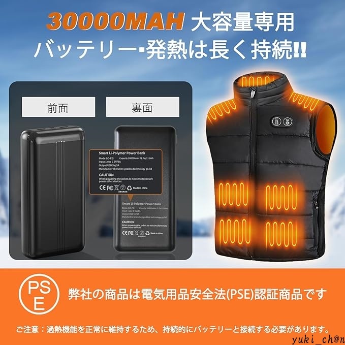 - 電熱ベスト 加熱ベスト ヒーターベスト XLサイズ 30000mAh大容量バッテリー付き 速暖 丸洗可 防寒ベスト 男女兼用 節電 省エネ