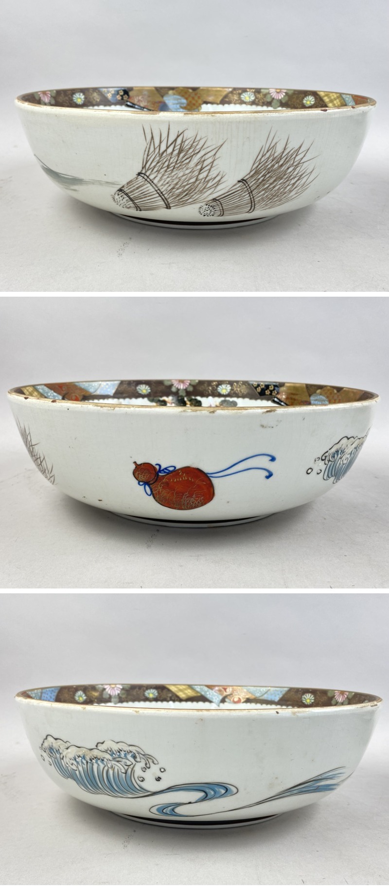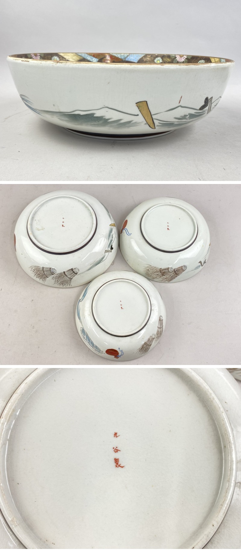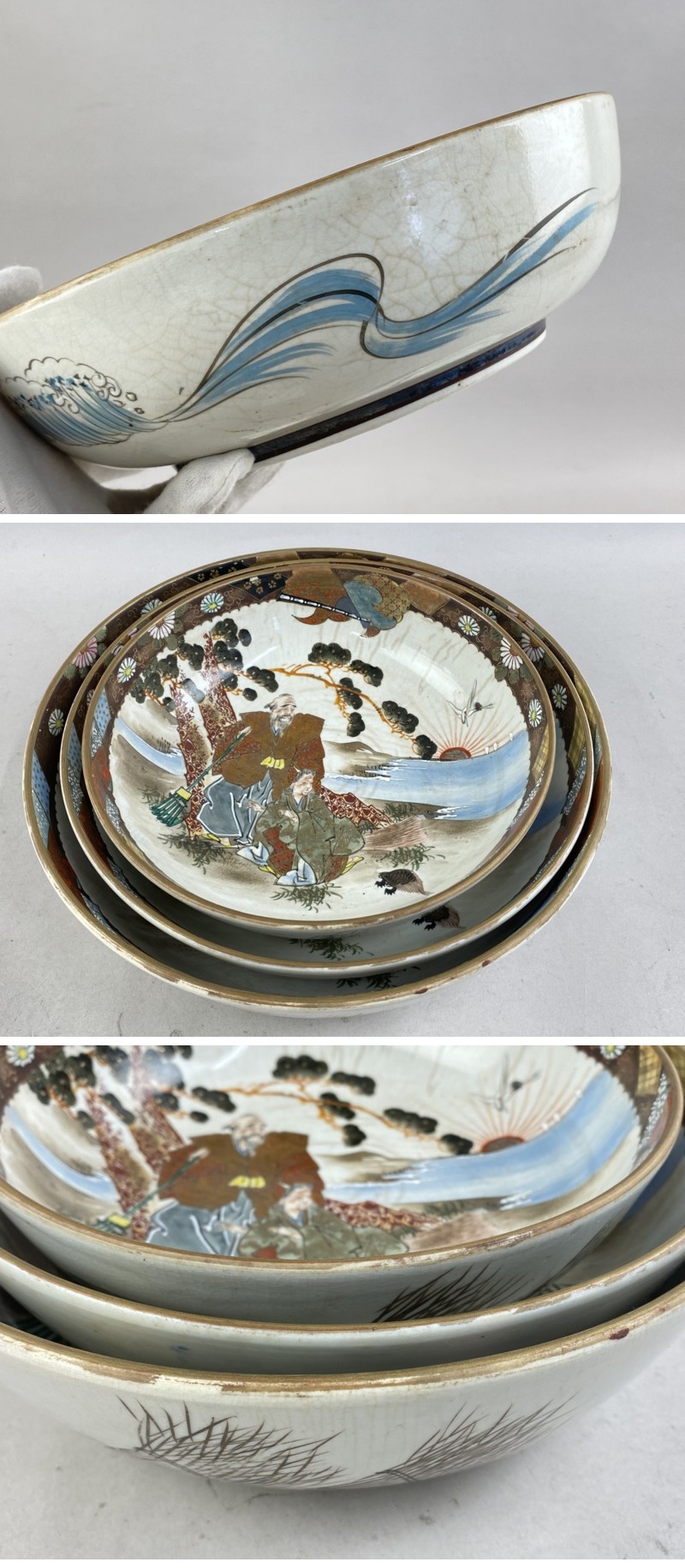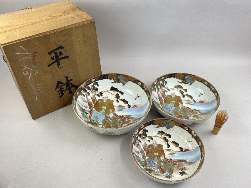 - ac545 九谷焼 三ツ組鉢 深鉢 3客セット 高砂図 色絵 金彩 人物 鶴亀 松 在銘 組鉢 三ツ鉢 盛鉢 大鉢 丼 時代物