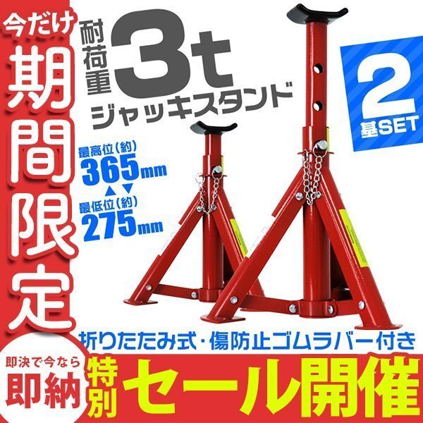 - 【数量限定セール】ジャッキスタンド 2基セット 耐荷重3t 馬ジャッキ 傷防止ゴムラバー付 高さ3段階 折りたたみ収納 タイヤ ホイール 新品