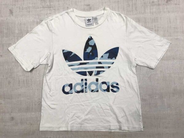 - アディダス adidas ロゴ ビッグプリント ミリタリー 迷彩カモフラ柄 スポーツ ストリート 半袖Tシャツ メンズ コットン100% S 白