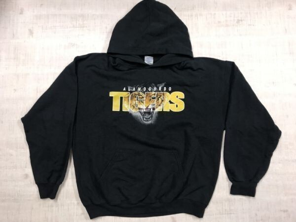 > GILDAN ギルダン製 アメカジ ストリート 古着 ニューメキシコ ALAMOGORDO TIGERS カレッジ スウェットパーカー プルオーバー メンズ L 黒