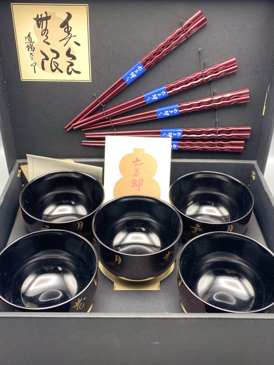 - 未使用保管品 山中塗 漆器 汁椀・箸セット 5客 和食器 お椀 吸物椀 道場六三郎 合成漆器