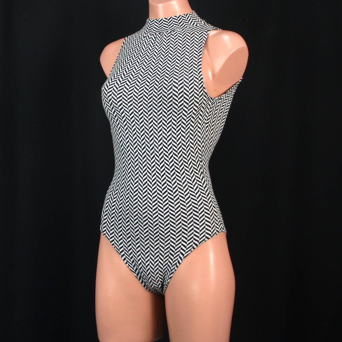 > E9806★レトロ おしゃれ 水着 ハイネック ワンピース レディース 9M モノトーン ハイレグ アクリル素材 黒白 日本製 水泳 プール ビーチ 海