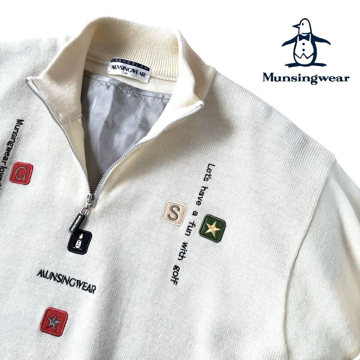 - マンシングウェア Munsingwear ハーフジップ 防風 ニット M ホワイト ジップアップ 刺繍 ウール セーター