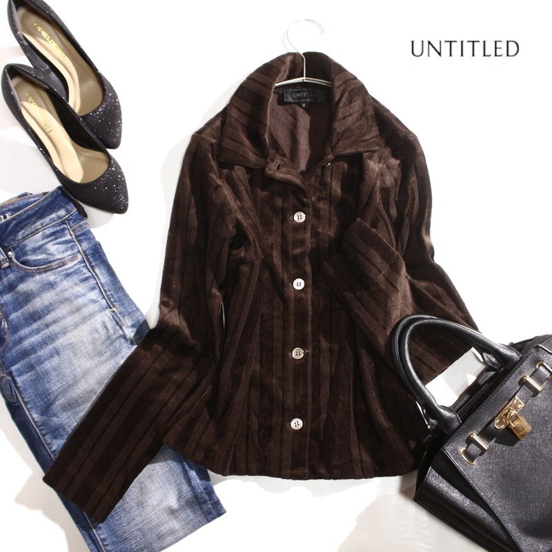 > 美品 アンタイトル UNTITLED 株) ワールド 秋 冬 ベロア ストライプ 厚手 起毛 長袖シャツ ジャケット 9号 ダークブラウン ほんのり艶