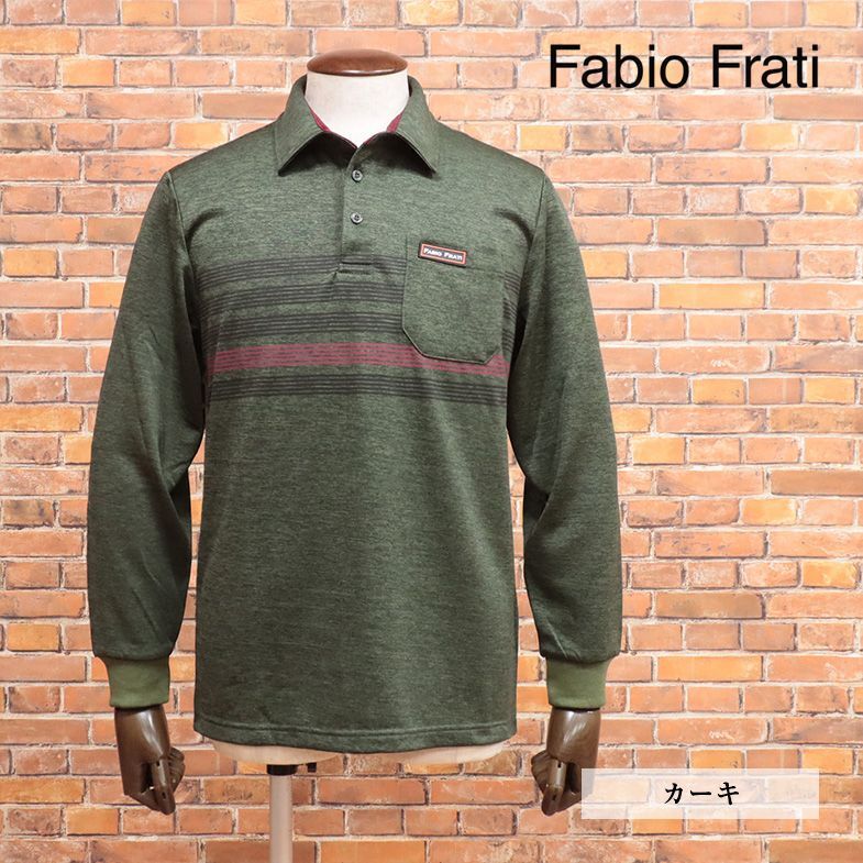 - 1円/秋冬/Fabio Frati/LLサイズ/裏起毛ポロシャツ ジャージー ボーダー柄 台襟 胸ポケット ワッペン ゴルフ 長袖 新品/カーキ/jt175/