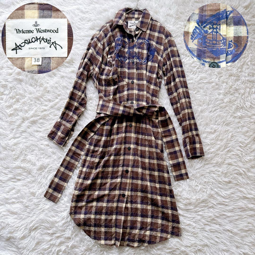> 希少 Vivienne Westwood ヴィヴィアンウエストウッド チェック柄 シャツワンピース ベルト付 オーブ ボウタイ オーブプリント 38 Mサイズ