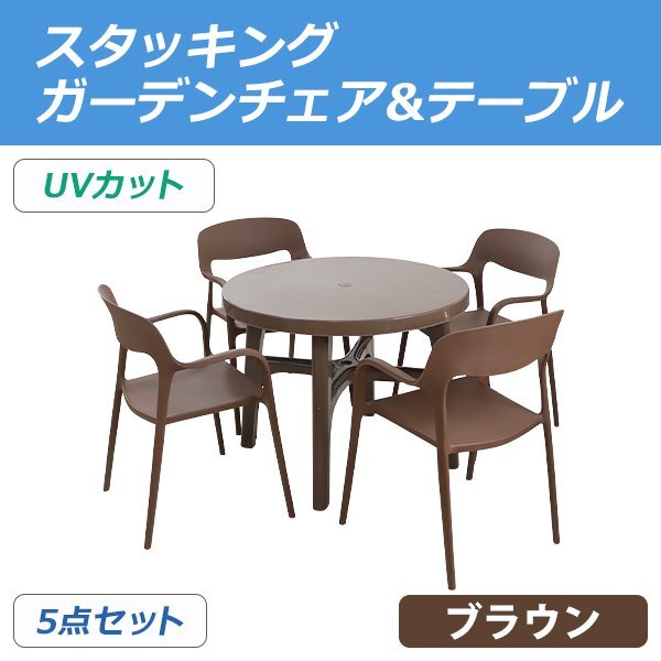 - 送料無料 プラスチックチェア ガーデンチェア ガーデンテーブル 5点セット UVカット ブラウン パラソル使用可 テーブル&チェアー4脚