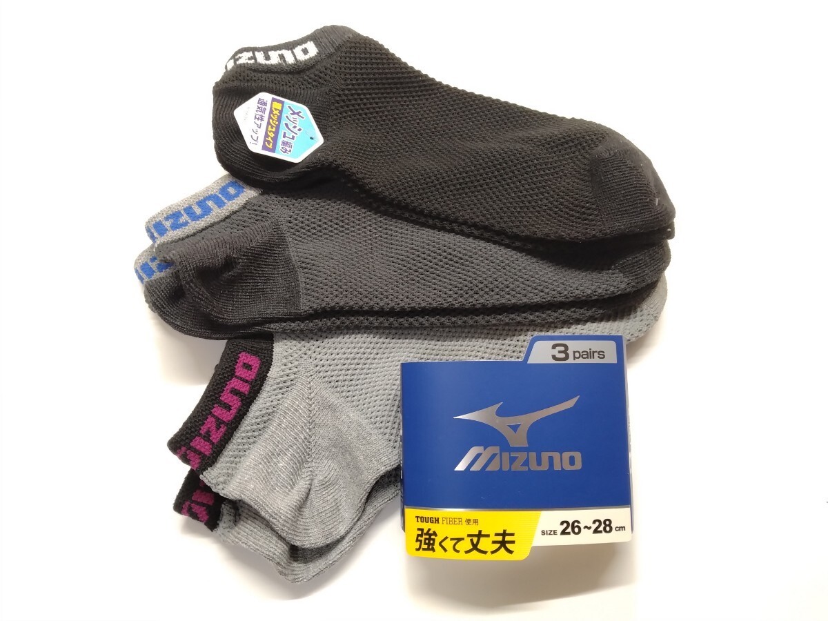 - 送料無料!★ミズノ ショートソックス3足組★新品★26cm~28cm★強くて丈夫★メッシュ編み(涼しい)★通気性アップ★35