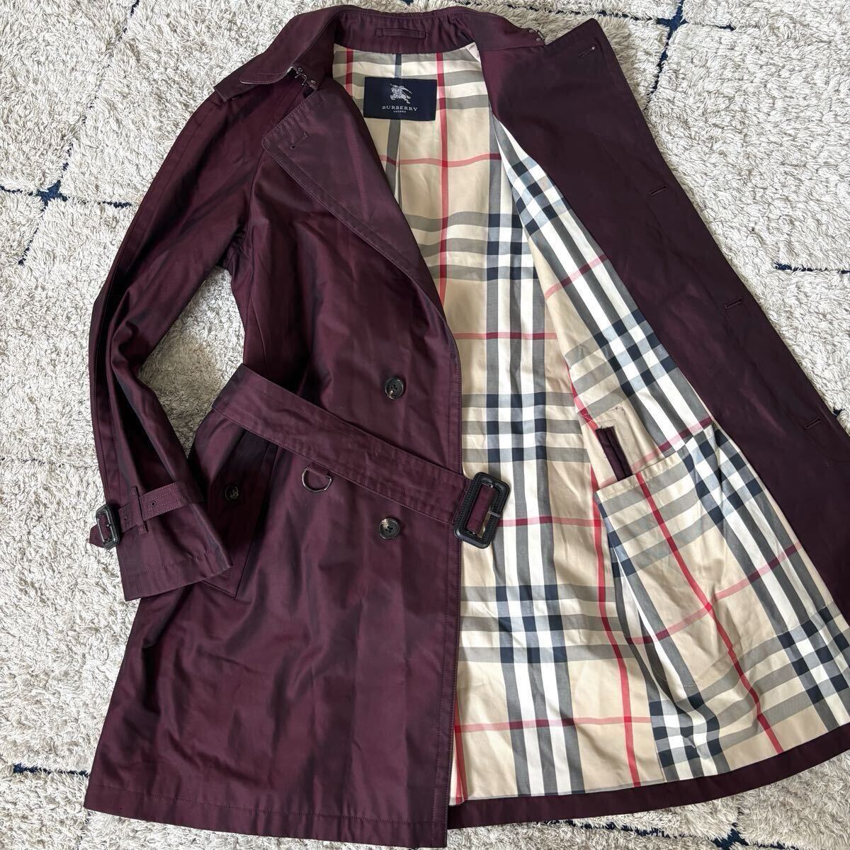 - 美品◆希少!Lサイズ!BURBERRY LONDON バーバリーロンドン トレンチコート ステンカラー 牛革 ベルト ボルドー メガチェック ギャバジン