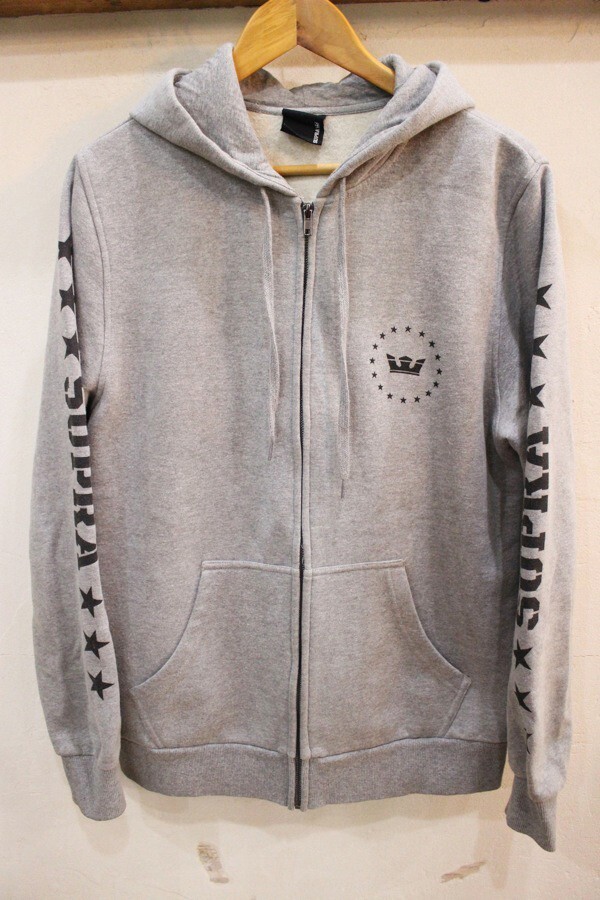 > 1603★SUPRA/スープラ ロゴプリントジップパーカー グレー メンズ 長袖 Mサイズ 袖プリント 裏起毛 ストリート 古着 USED ★