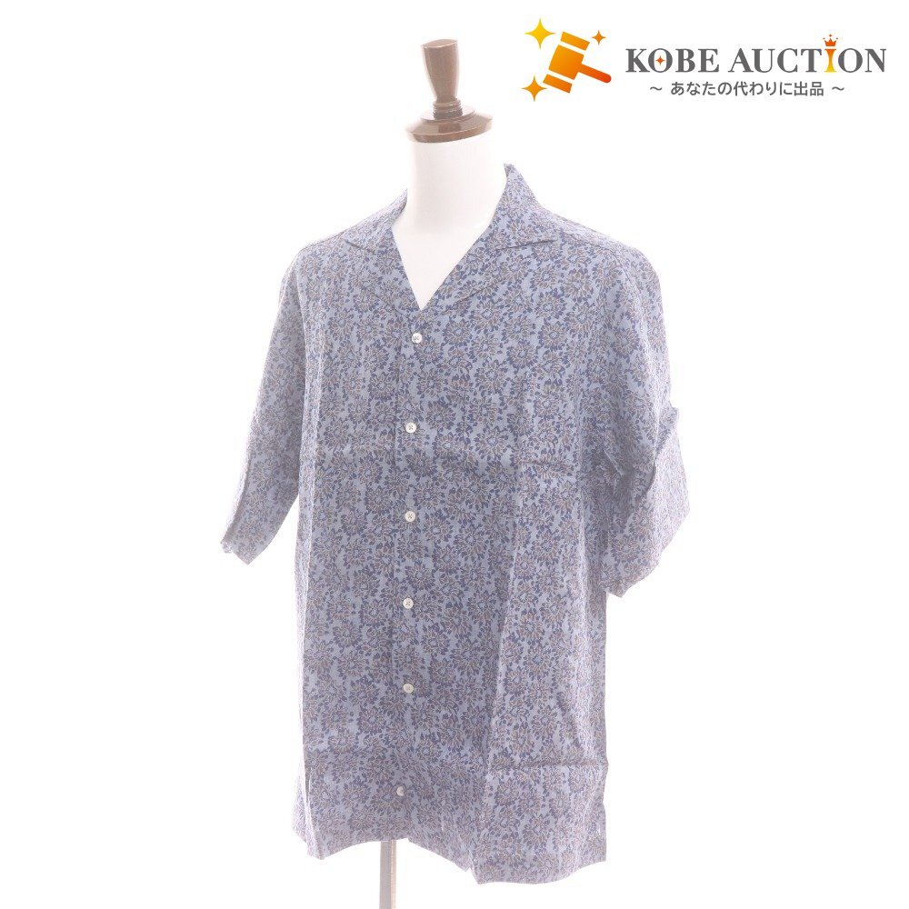 > ■ ガリポリカミチェリア オープンカラーシャツ 半袖 トップス 花柄 麻100% メンズ 50 ネイビー系 タグ付き 未使用