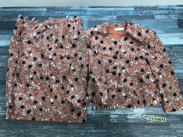 - remalon レディース 総柄 花 ジャケット・スカート 上下セットアップ 綿 肩パッド オレンジ黒