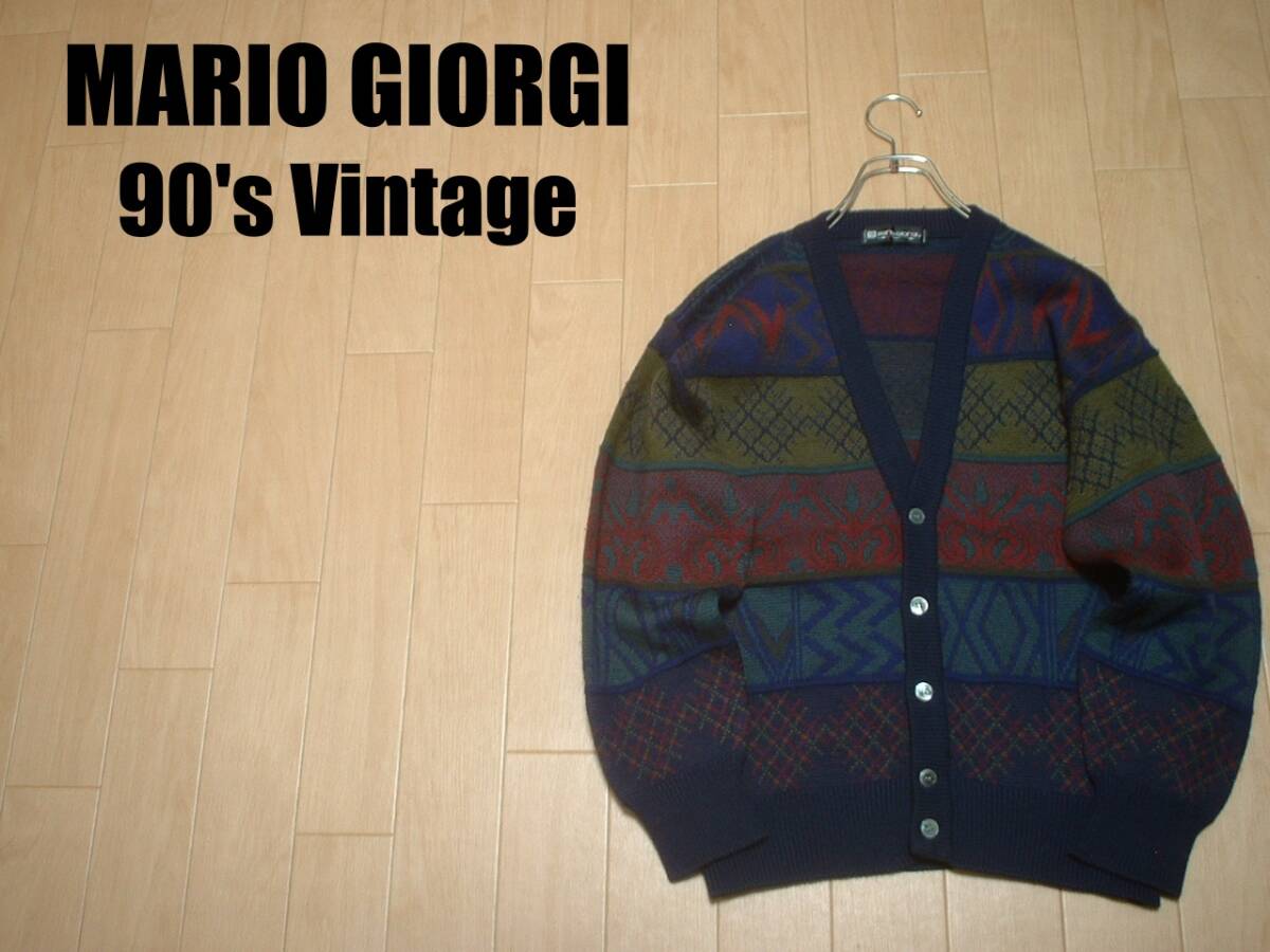 > 90sビンテージMARIO GIORGI総柄ニットウールカーディガンM正規マリオジョルジITALYネイティブ柄セーターノルディックフェアアイル立体3D