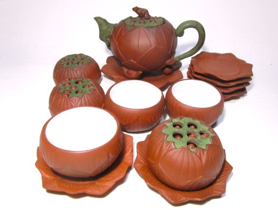 - 稀少 美品★中国茶器セット 蓮レリーフ 茶壷 小茶杯 14点セット 陶印 急須 茶碗 茶盃 茶壺 煎茶道具 中国茶 朱泥 紫泥 紫砂★《検》宜興
