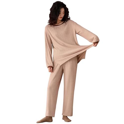 - [HEWEAYTA] パジャマ レディース 長袖 ロング丈 - ルームウェア 春秋冬 ニット 丸首 上下セット 部屋着 無地 快.
