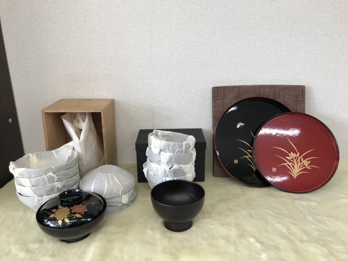 > 2239 漆器 まとめ売り 5・4客セット 器 盆 食器 和食器 蓋付 汁椀 工芸品 漆芸 花柄 黒 赤 インテリア アンティーク 雑貨 他
