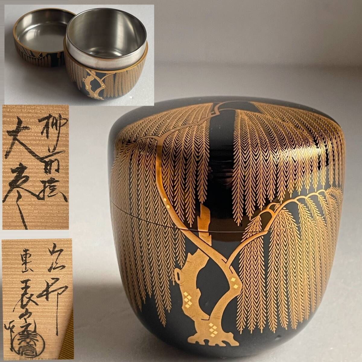 - 【和美】塗師 川瀬表完 柳蒔絵 大棗 共箱 茶道具 本物保証 内銀 棗 16.6