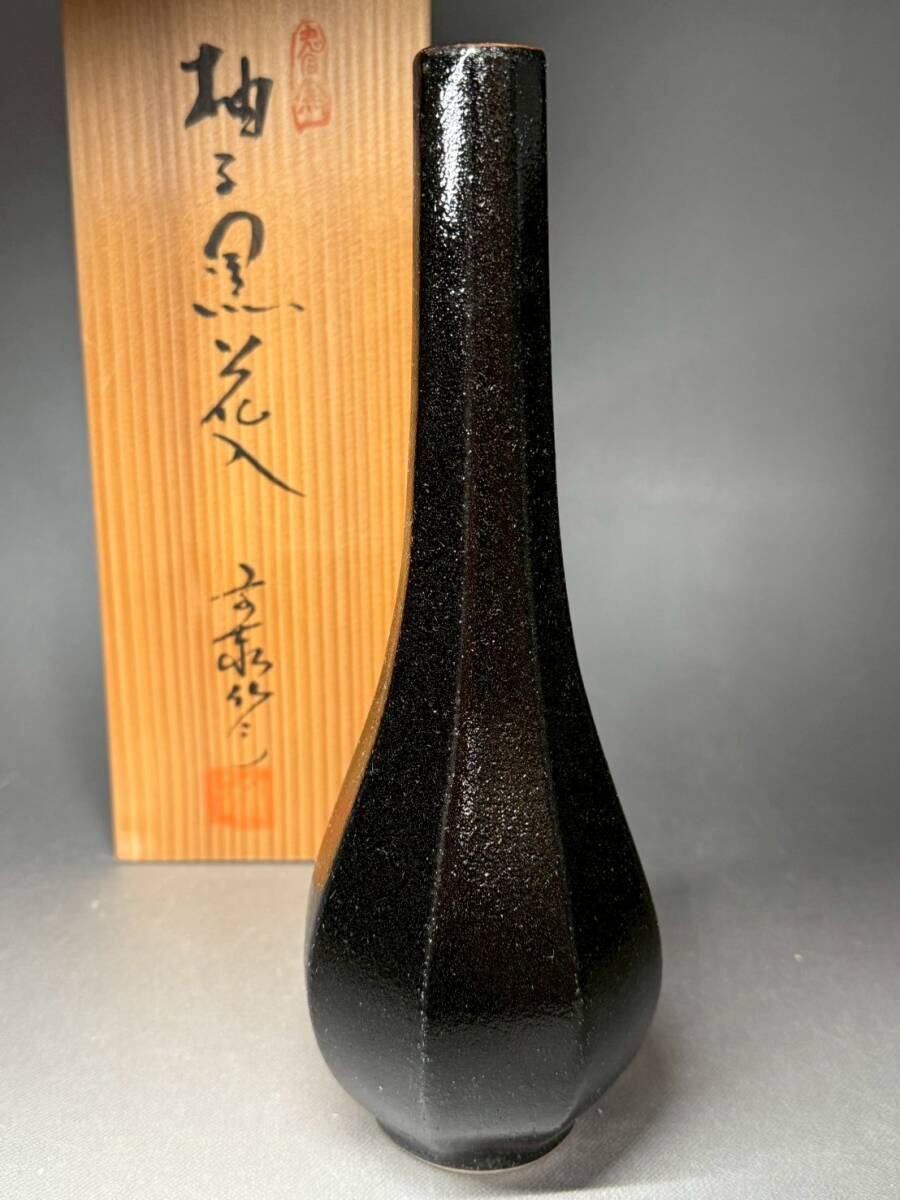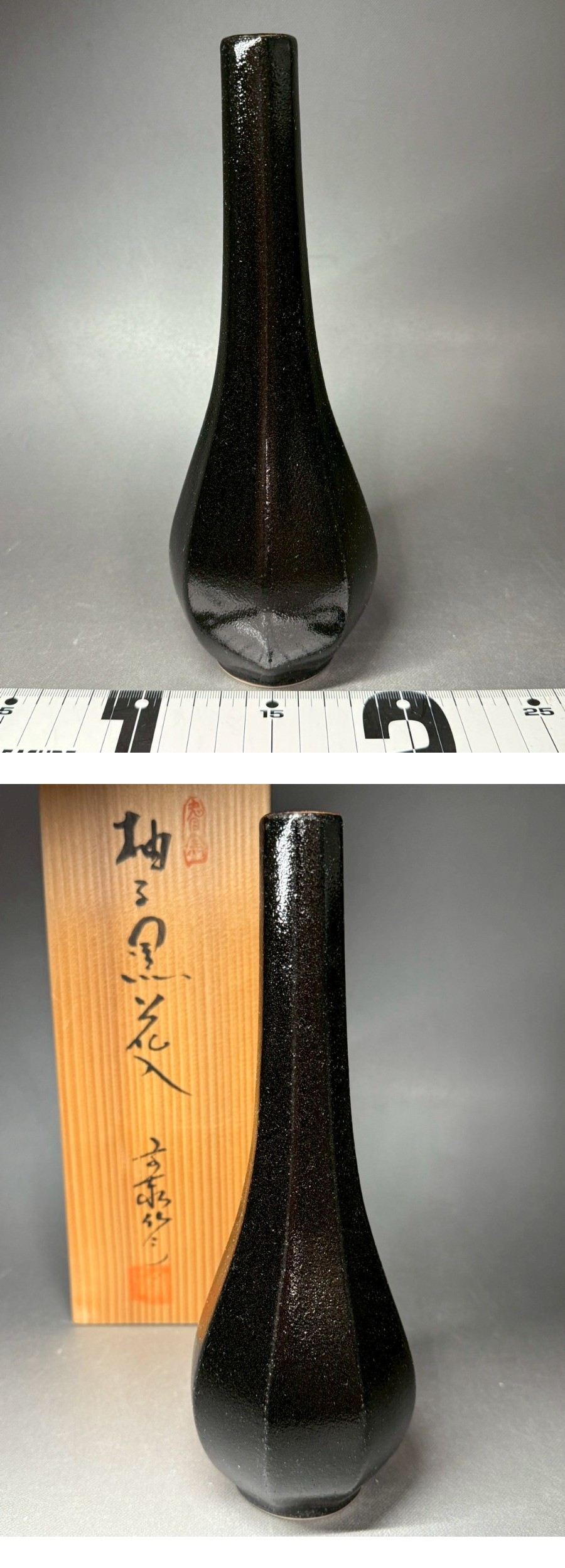> 瀬戸 兎月窯 柚子黒 花入 杉浦芳樹 骨董 置物 飾物 日本伝統工芸品 芸術 古美術 時代物 壺 花瓶 花生 壷 華道具 在銘 落款 売切58