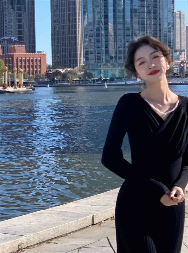 - 長袖ワンピース パールチェーン ハイウエスト ニットワンピース 冬 新作 ひざ丈ワンピース L レッド