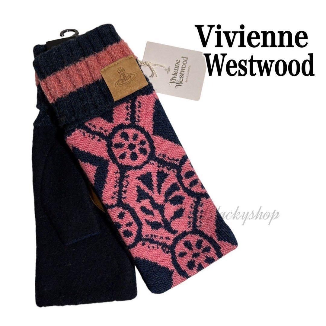 > ヴィヴィアン ウエストウッド 手袋 フィンガーレス アームカバー ニット 未使用 タグ付き レディース ネイビー×ピンク 21-22cm 指抜き