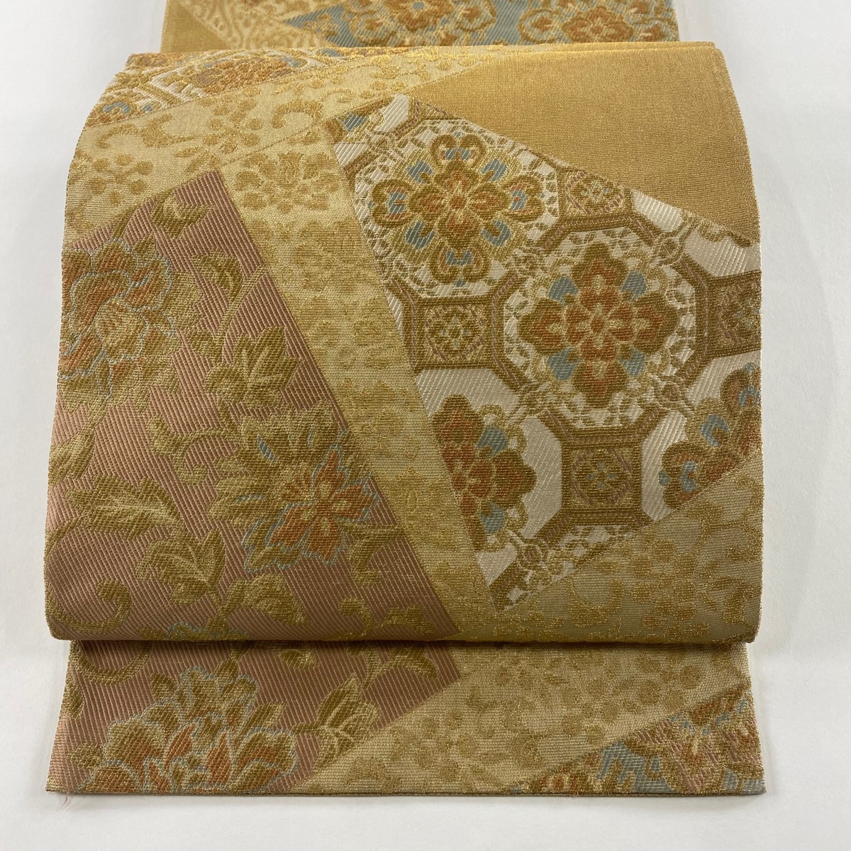 - 袋帯 名品 蜀江華文 裂取り 輪奈織 金糸 薄茶色 六通 正絹 【中古】