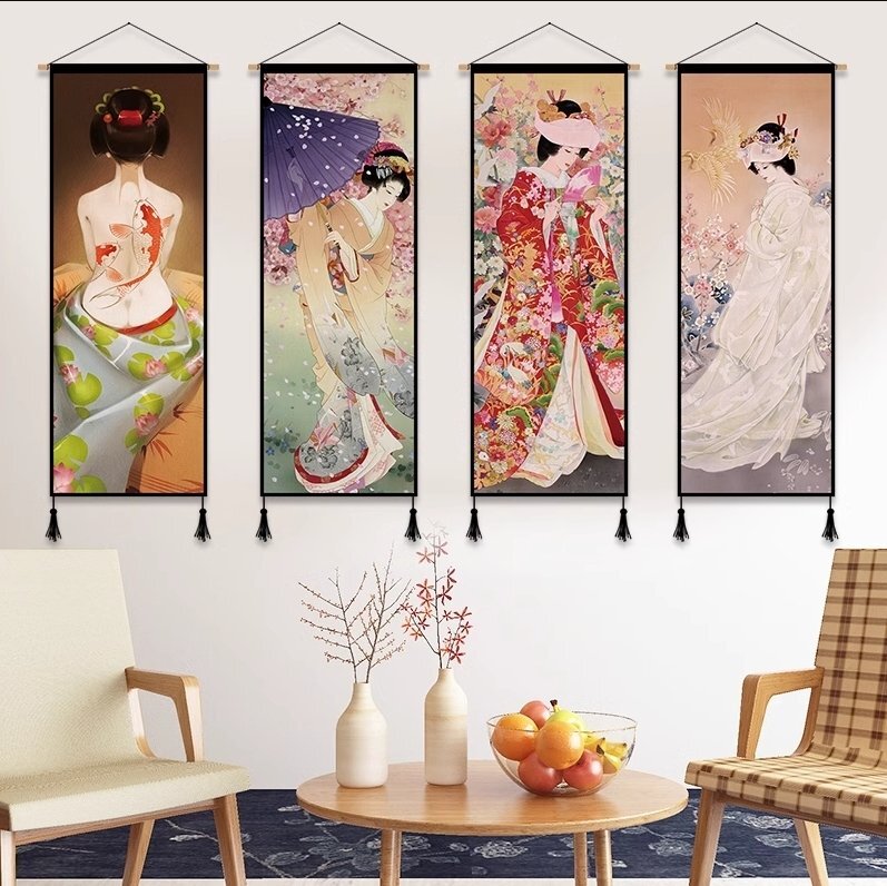 > 高級感満載!玄関背景布アート寝室ベッドサイド壁装飾画浮世絵仕女図掛絵和風店舗 4点セットです 45*120cm 未使用