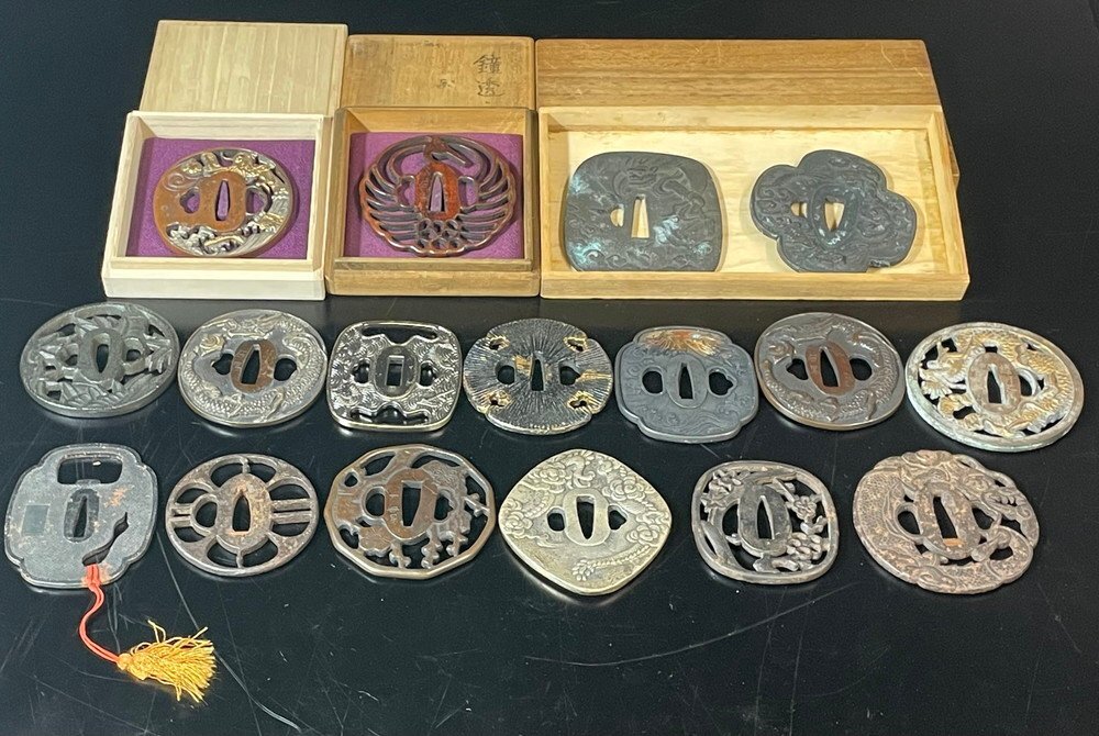 > 【8AP3439】時代物 鍔 つば 16点まとめ 木瓜形 丸形 四方形 金彩 花紋 など 刀装具 武具 日本刀 刀剣 古美術品 骨董 アンティーク 現状品