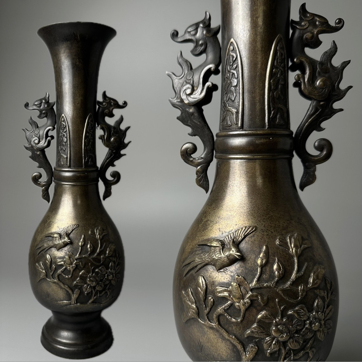 - コレクター買取品 中国美術 青銅器 双耳付 龍耳 花鳥文 細密彫刻 銅器 銅製 飾壺 花瓶 唐物 花入 花器 中国古玩 飾物 置物 時代物