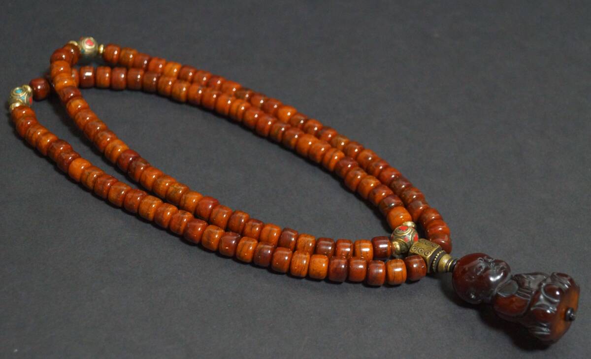 > 【閑】オールドチベットヤクの骨108個桶形玉念珠 数珠 周長95cm ヤク角 細工彫り仏像 銅製金具ターコイズ装飾付き★s71107