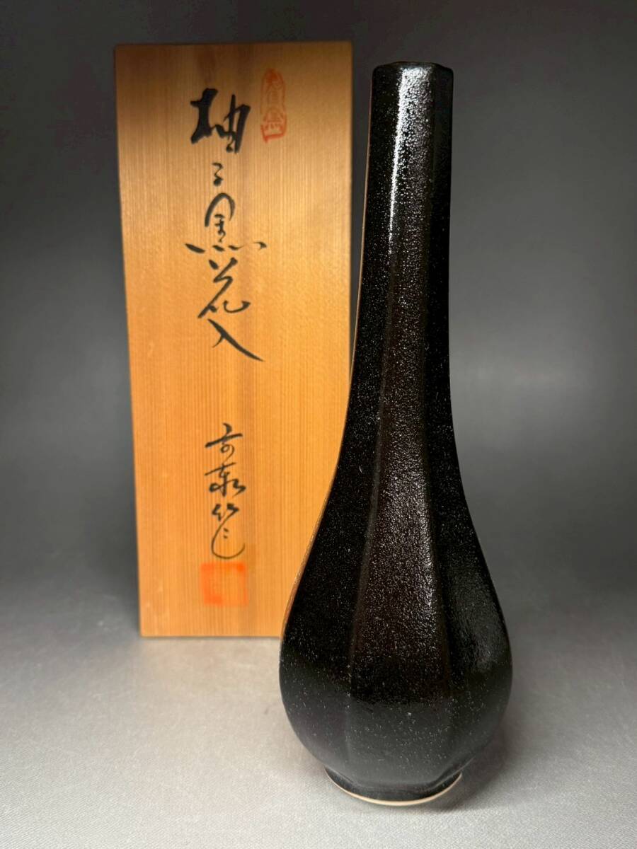 - 兎月窯 杉浦芳樹 柚子黒花入 鶴首 花生 花瓶 一輪挿 骨董 置物 飾物 日本伝統工芸品 芸術 古美術 時代物 在銘 落款 売切 初出51