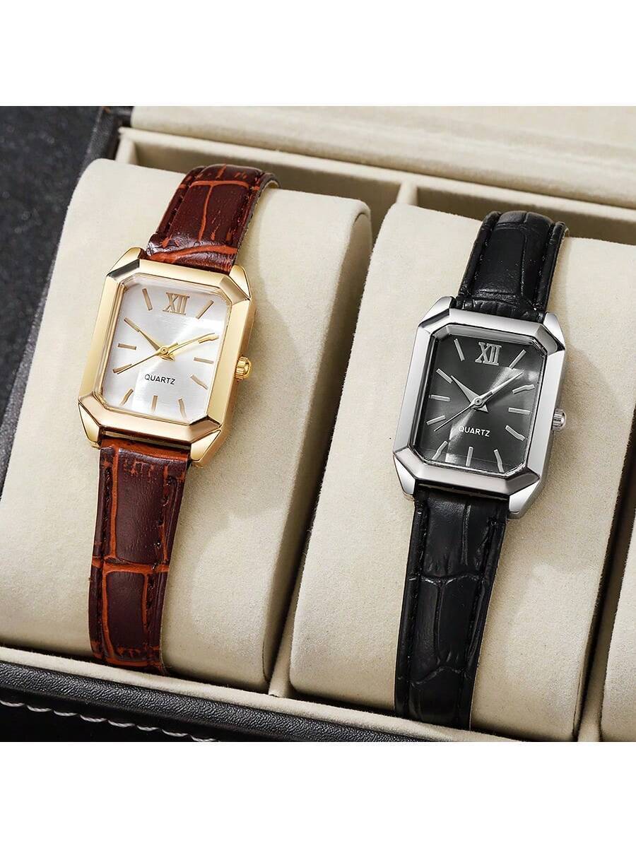 - 腕時計 レディース セット 高級ゴールド スクエア レディース腕時計 2個セット、上質なレザー、ビジネス&レジャー用、女性への贈り