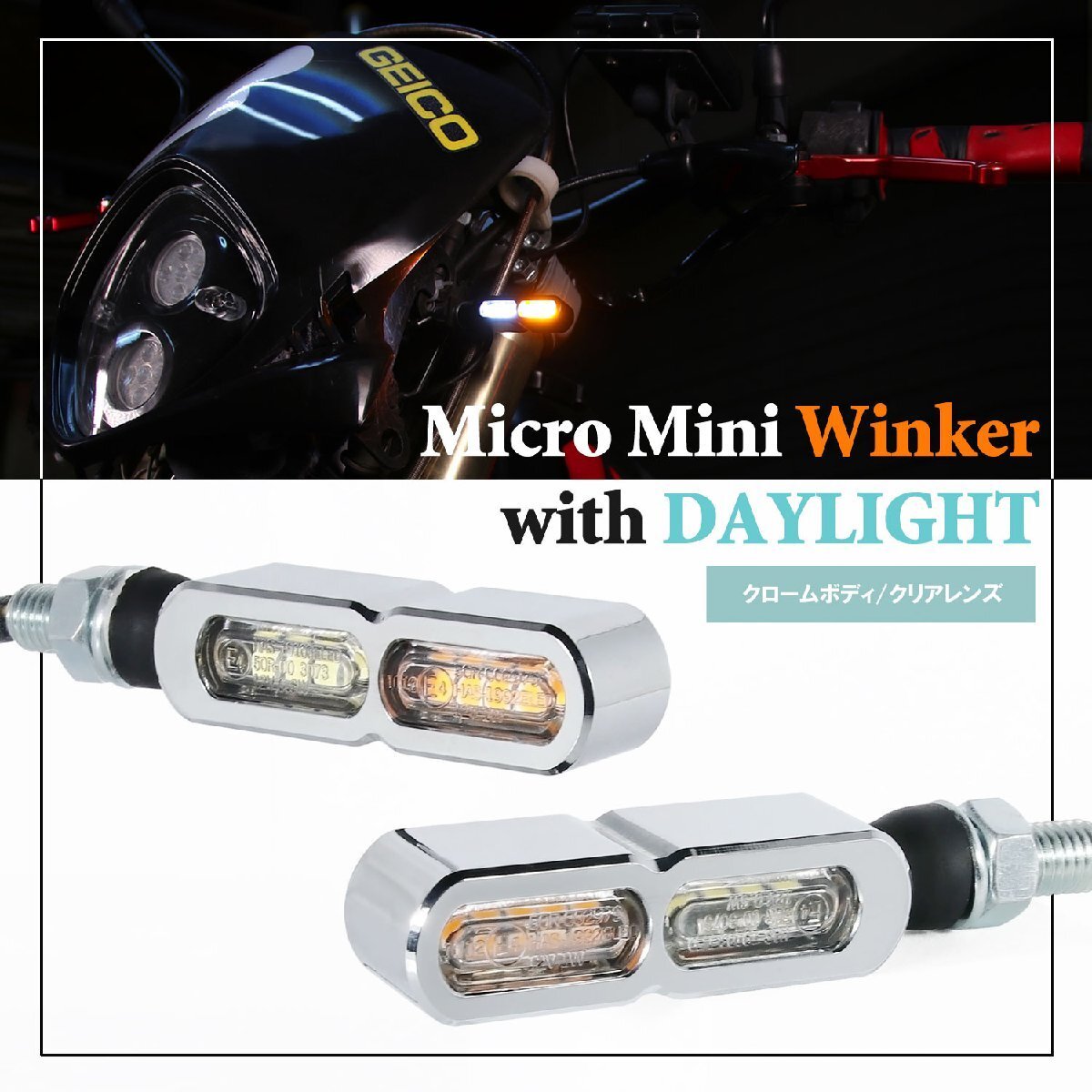 > デイライト付 マイクロミニウインカー ダブル フロント用 LED 車検対応 クローム メッキ クリア レンズ 12V 汎用 アルミ製 左右セット