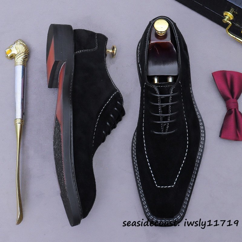 - 定価10万超◆最高級 ビジネスシューズ メンズ スエード革 本革 レザーシューズ 職人手作り 紳士靴 革靴 牛革 宴会 結婚式 ブラック 25.5cm