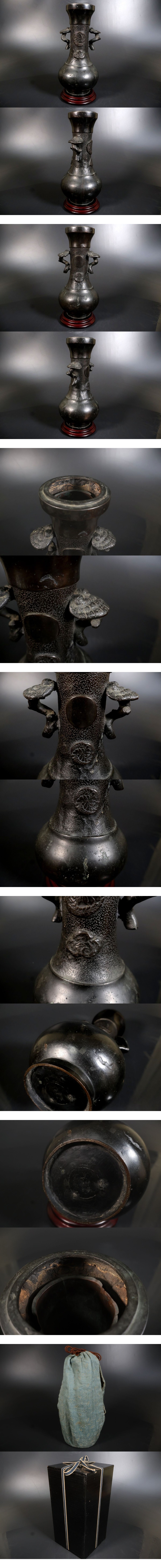 - 【小】5367 江戸期 黒田家藤巴紋古銅霊芝耳付花生 花瓶 時代箱有 仕服有 福岡県某寺院のうぶ品
