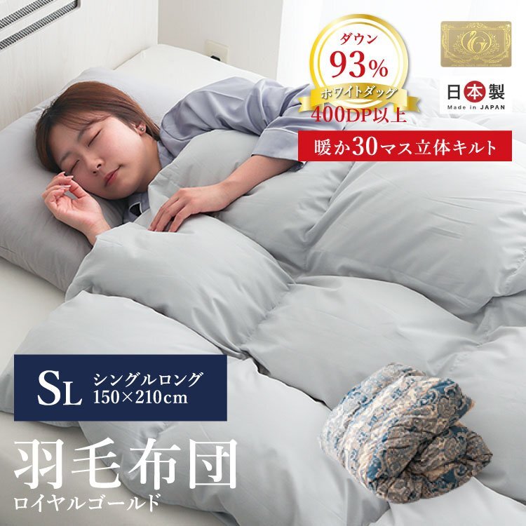 - 【ブルー】シングル 羽毛布団 ダウン93% 400dp 日本製 立体キルト ロイヤルゴールドラベル認定 掛け布団 抗菌 防カビ 快適 羽毛 寝具