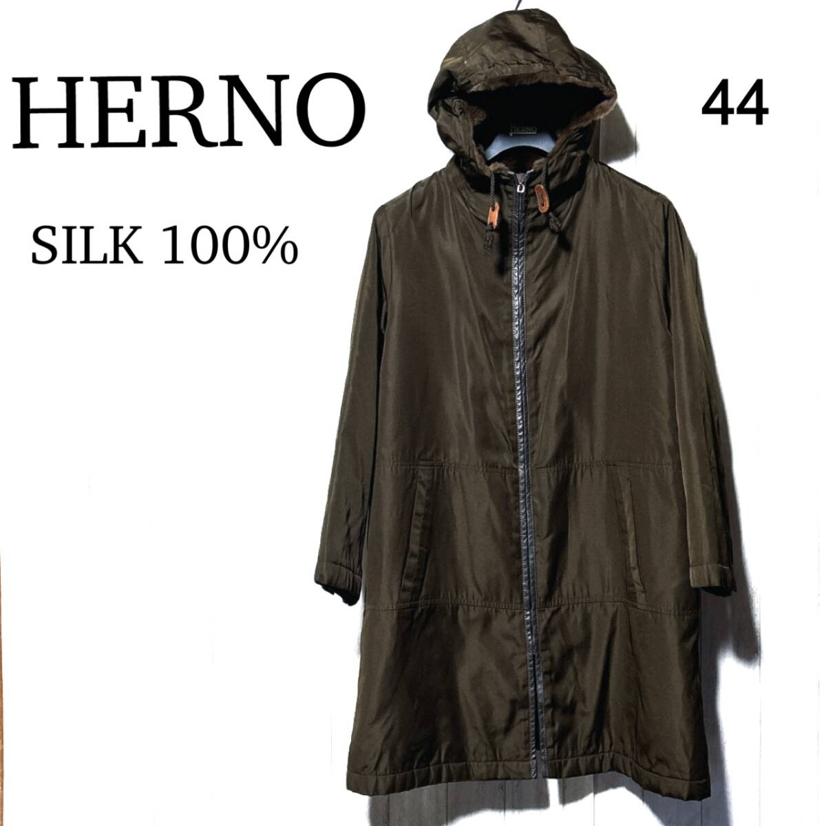 - ヘルノ シルク フードコート 44 HERNO フード内ファー(ウィーゼル)ロングコート 大きいサイズ アオイ期 伊製