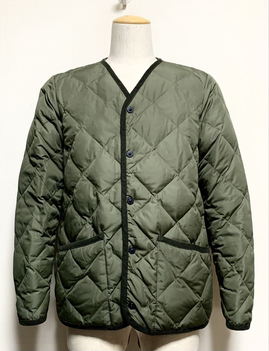 > 美品:TAION(タイオン).ノーカラー ダウン キルティング ジャケット L(メンズ/カーキ/CITY LINE/肩44幅55丈70/インナーダウン/uniqlo ships)