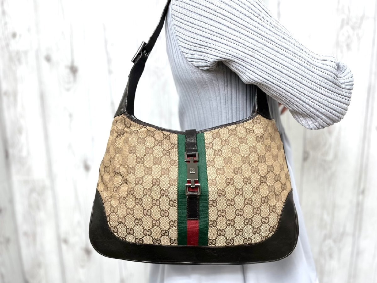 - 美品 GUCCI グッチ GGキャンバス シェリーライン ジャッキー ハンドバッグ ショルダーバッグ バッグ キャンバス×レザー 茶系 91903