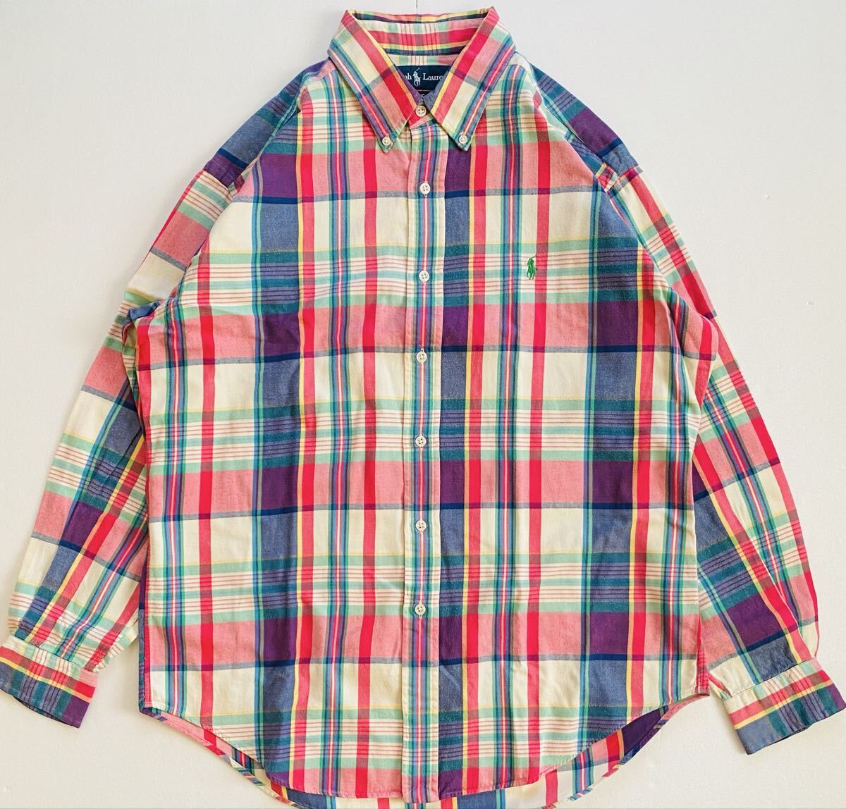 > ビンテージ◆RALPH LAUREN ラルフローレン マルチカラー チェック ボタンダウン 長袖シャツ ネルシャツ マルチカラー メンズL インパクト21