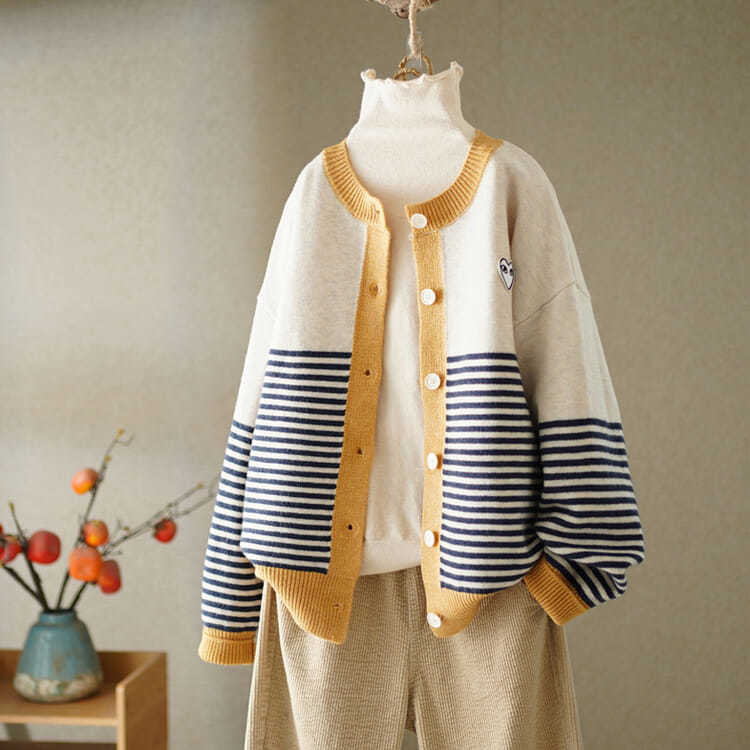 - 新作オシャレ ニットカーディガン レディース長袖ボーダー柄切り替え ニットセーター ゆるカーディガン ニットトップス イエローお色選択可