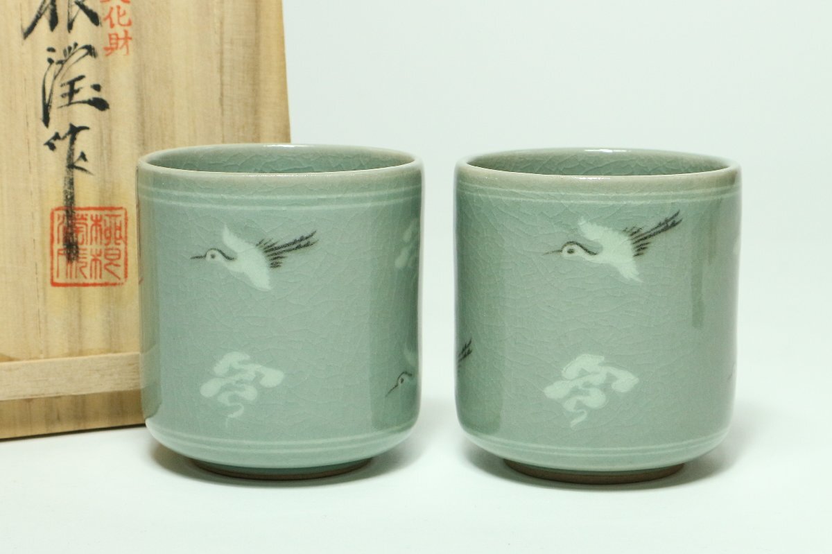 ・韓国人間文化財 柳海剛 (柳根瀅) 高麗青磁 雲鶴象嵌 夫婦湯呑 共箱 / 湯飲み 二客